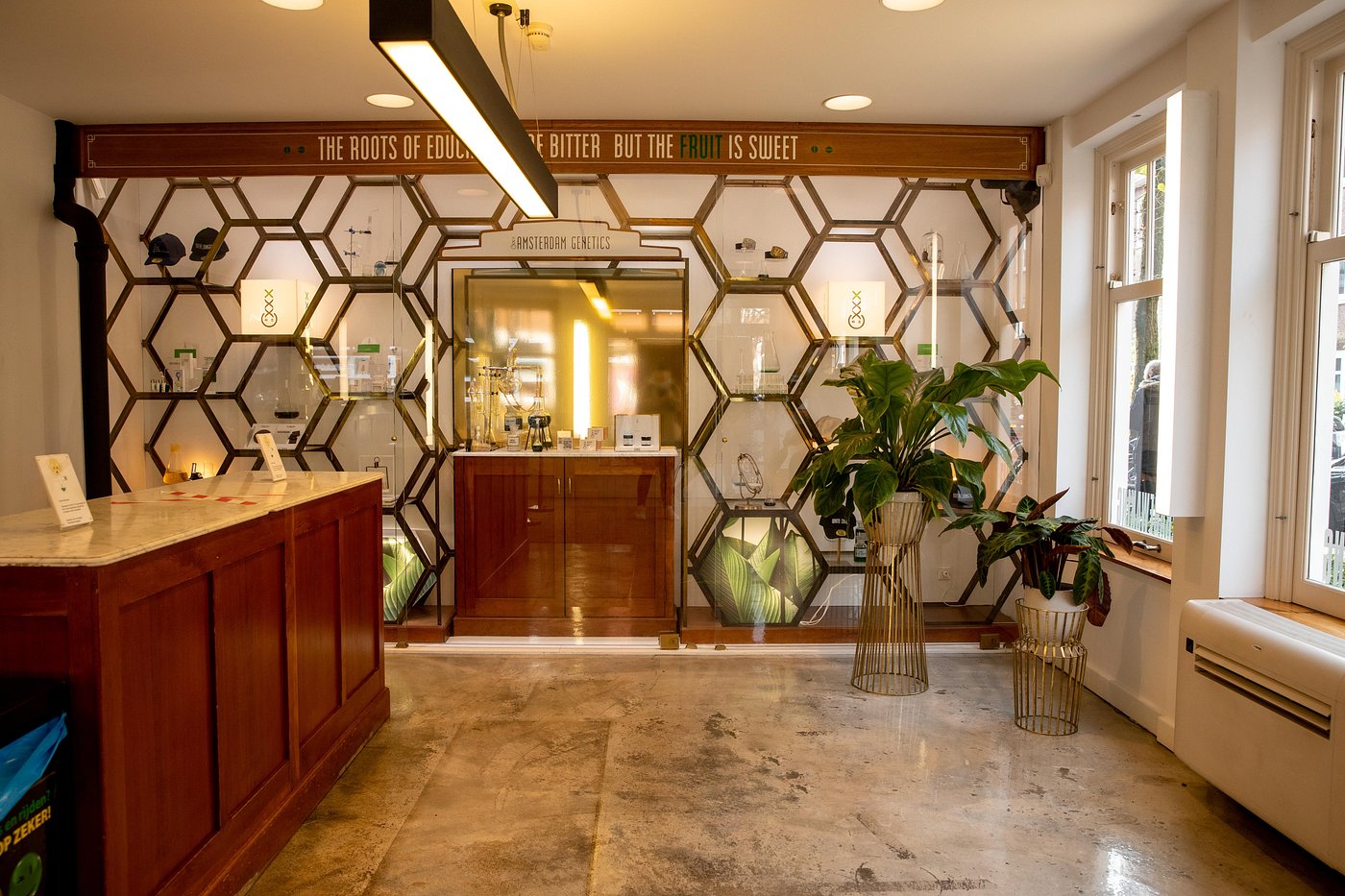 Het eerste dat opvalt bij binnenkomst is het personeel in witte laboratoriumjassen — een stijlkeuze die bij Boerejongens-shops kenmerkend is geworden. De ruimte zelf is compact maar doordacht ingericht, met elementen die verwijzen naar de Amsterdamse Schoolstijl. Achter de toonbank hangen vintage houten specimenlaadjes van een oude apothekerskast, de wanden zijn voorzien van vitrines met merchandise en producten, en digitale menu's begeleiden je door het aanbod. Het geheel voelt strak en professioneel, zonder de warmte te verliezen die je van een buurtshop verwacht. Er is geen rookruimte, maar wel een hoge tafel met krukken waar je rustig kunt draaien voor je de deur uit gaat.