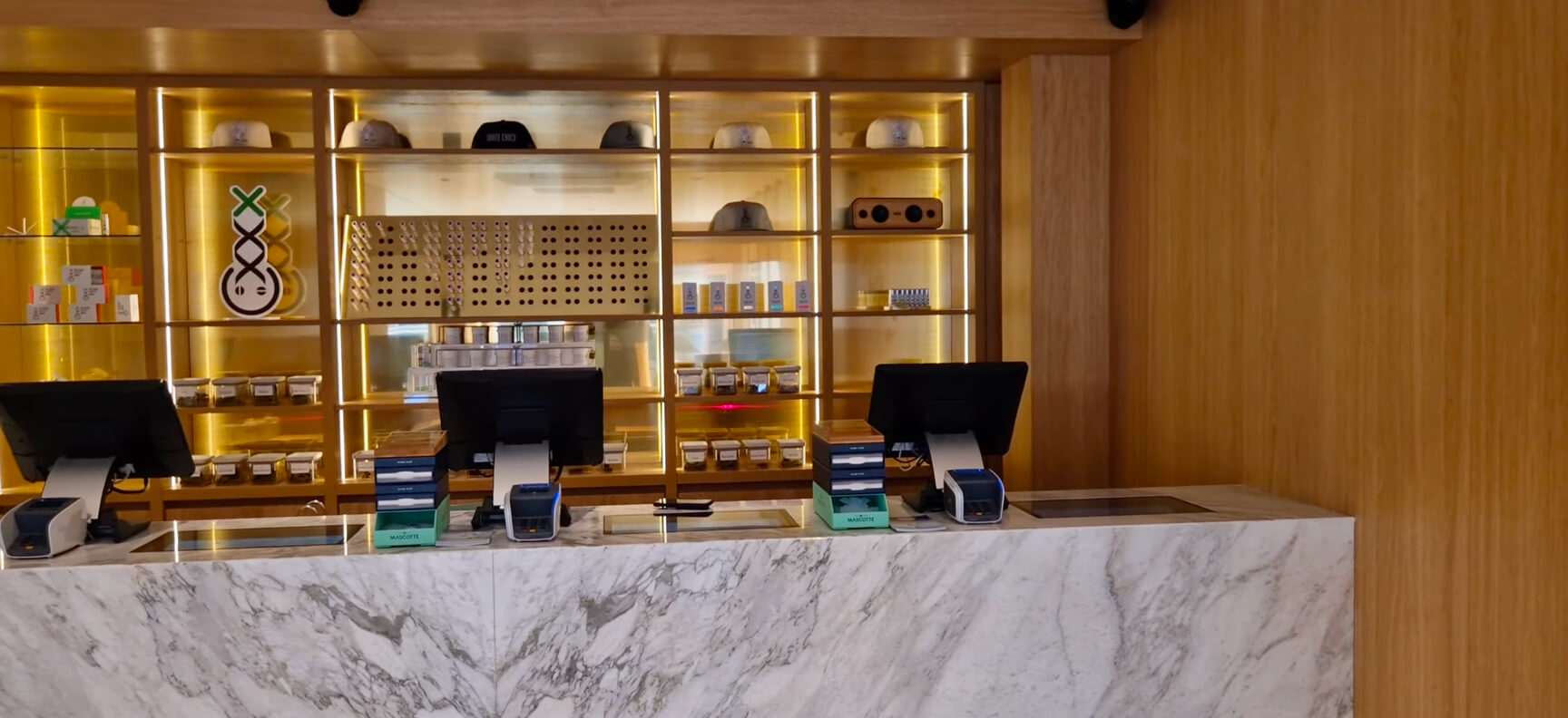 De Derde Oosterparkstraat is geen straat waar toeristen vanzelf terechtkomen, en dat is precies wat veel bezoekers waarderen. De shop zit in een rustige, diverse woonwijk waar de sfeer anders is dan in het centrum. Bij de heropening is het pand volledig verbouwd in de kenmerkende Amsterdam Genetics-stijl: strakke lijnen, warme verlichting, marmer en gouden accenten. Het oogt verzorgd en modern, zonder kil te worden. De ruimte is compact maar overzichtelijk, met een duidelijke menukaart en een toonbank waar je rustig kunt kiezen.