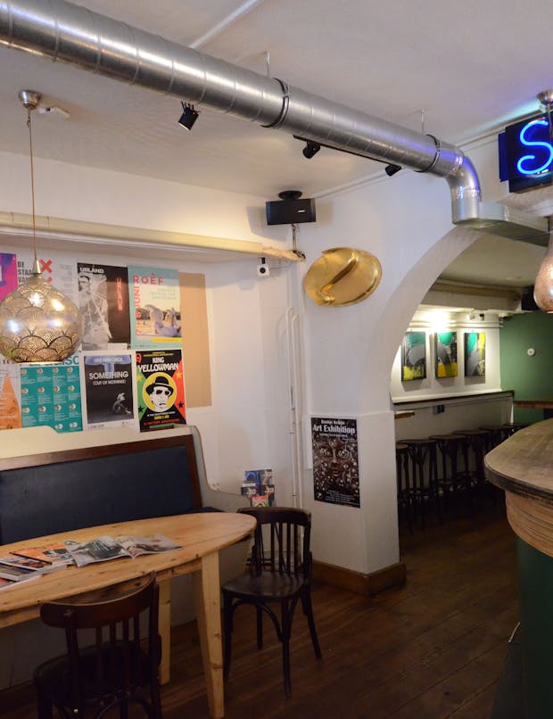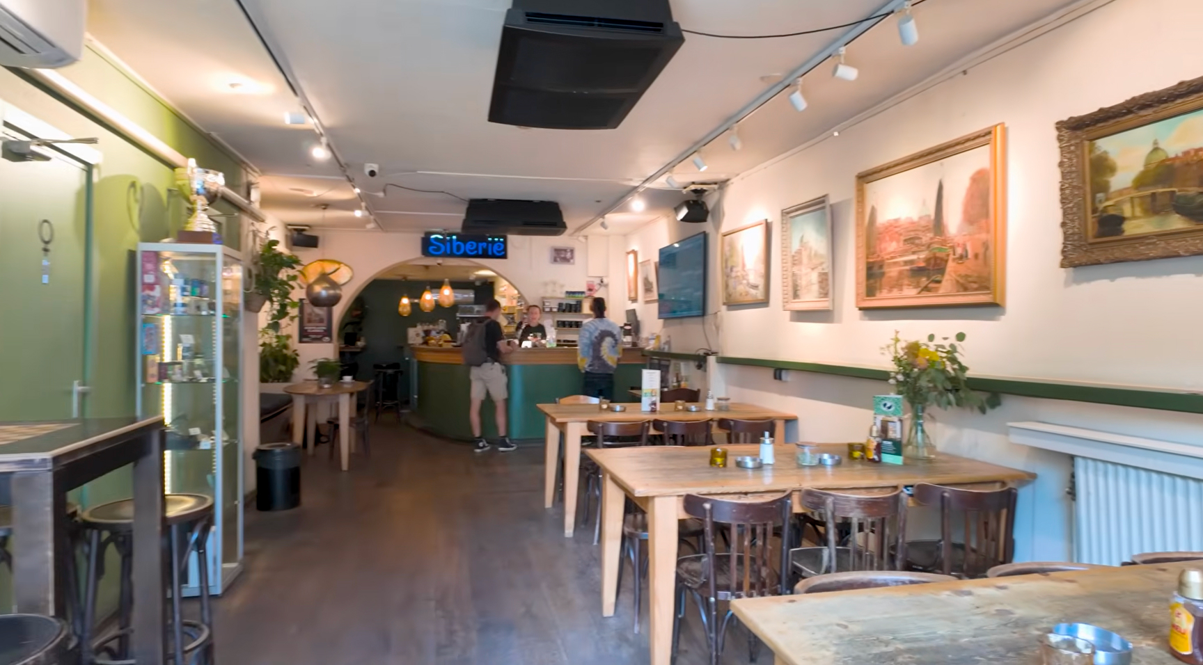 Wat Siberië al sinds het begin onderscheidt, is de verbinding met kunst en muziek. De muren hangen vol met wisselende exposities, het personeel bestaat deels uit kunstenaars en muzikanten, en de sfeer leunt meer richting een klein cultureel café dan een standaard coffeeshop. Overdag valt het licht door de ramen naar binnen op de gracht, 's avonds wordt het intiem en gezellig. Er staat een flipperkast bij de deur, er liggen bordspellen klaar, en er is altijd wel iemand voor een goed gesprek.