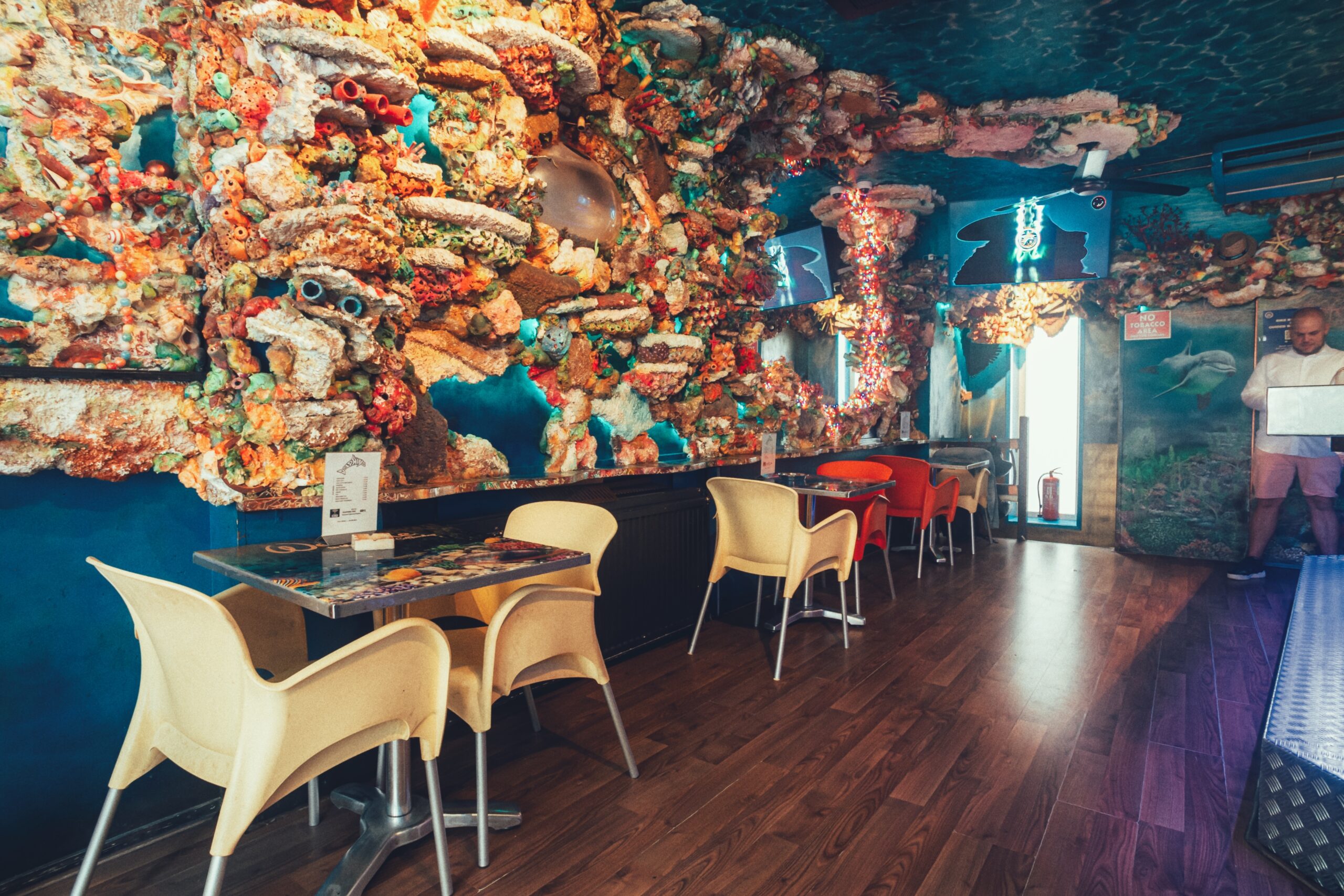 Wat The Dolphins bijzonder maakt is het interieur. De bovenetage is een compact café met tafels en barkrukken, maar de echte beleving zit beneden. Daar stap je een ruimte binnen die volledig is beschilderd als een onderwaterwereld — koraalriffen op de muren, dolfijnen aan het plafond, goudvislampjes als verlichting. Met ruime loungebanken en gedempte muziek voelt het als een plek waar je even helemaal weg bent uit de stad erboven. Het is kitscherig en dat is precies het punt — The Dolphins neemt zichzelf niet te serieus en dat maakt het een verfrissende plek in een stad vol strakke interieurs en minimalistische shops.